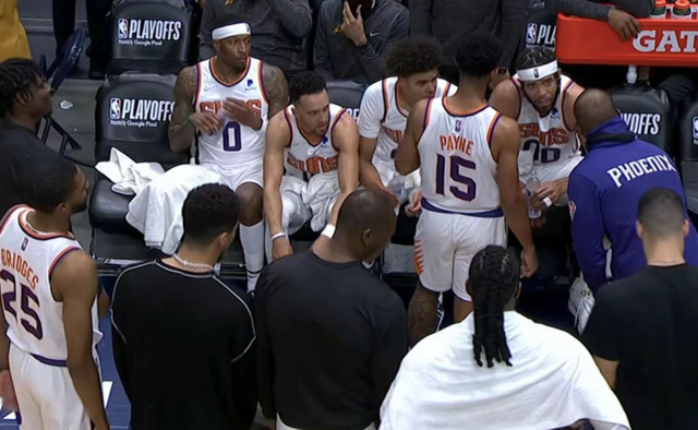 没有了布克,即便对手是八号种子,太阳想要赢球也不容易。整个上半场,保罗5投2中,三分3中1,罚球2中2,得到了7分1篮板8助攻1抢断,正负值为+17。