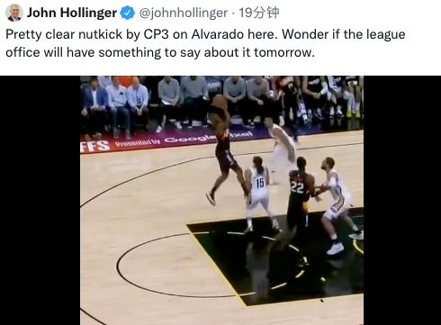 值得一提的是,比赛中保罗也上演了争议一幕,面对阿尔瓦拉多的防守,保罗急停跳投出手,有一个抬腿踢人的动作,鹈鹕后卫捂着肚子痛苦蹲地。名记John Hollinger认为,保罗踢人动作相当明显,他好奇联盟是否会追罚保罗。